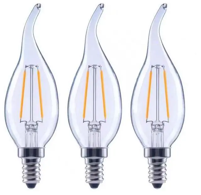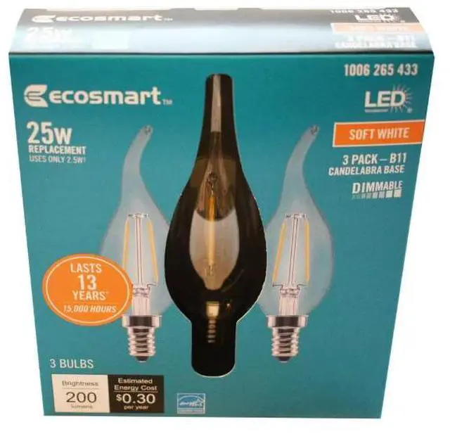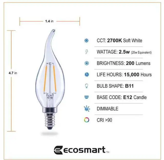 The 25-Watt Equivalent EcoSmart B11, E12 base filament LED light bulb is a stylish replacement for traditional incandescent bulbs - with all the benefits of LED technology. These LED light bulbs are dimmable, have a clear all-glass exterior, and provide an omni-directional (360°) distribution of light. Save on your energy bill every month! The energy efficient EcoSmart 25-Watt equivalent decorative LED filament light bulb offers a 90% savings over traditional lighting by using only 2.5-Watts of energy. This bulb emits 2700K (Soft White) color temperature, which is essential in creating a relaxing, balanced feel throughout your home. It is recommended for living rooms, kitchens, bathrooms, and bedrooms. Customize your lighting style with this dimmable bulb by adjusting your light from soft white to a relaxing, low light. This bulb is 90 CRI (color rendering index) meaning it is considered excellent at color rendering. The 15,000-hour lifespan and 5-year warranty makes these light bulbs