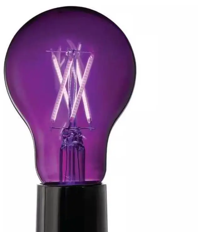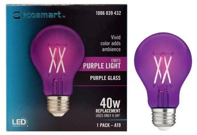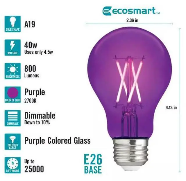 The EcoSmart 40-Watt Equivalent A19 Dimmable Filament Purple Colored Glass LED Light Bulb is a stylish direct replacement for traditional incandescent bulbs with all the benefits of LED technology. The bulb emits a vibrant purple light, making it the perfect way to add a pop of color to any room. These LED light bulbs are dimmable and provide an omni-directional 360° distribution of light. The EcoSmart 40-Watt Equivalent A19 Dimmable Filament Purple Colored Glass LED Light Bulb uses only 4.5 watts of energy that is an 88% savings over traditional lighting and that means savings on your energy bill every month. The 25000 hour lifespan and 5-year warranty makes these light bulbs a great choice for applications in your home and office. Start saving today with EcoSmart.