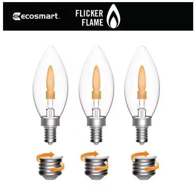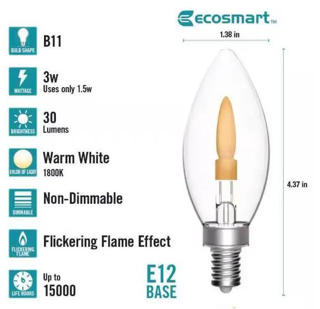 Illuminate your home with the EcoSmart flickering flame light bulb. This bulb emits 30 lumens of warm white light and only uses 1.5-Watts of energy. The flame tip shape creates a realistic flickering flame effect, and creates a relaxing environment. Best suited for wall sconces, chandeliers, lanterns, and more. These bulbs are rated for 80 CRI (color rendering index). The LED light bulbs are Indoor (wet rated) and able to be used in enclosed fixtures. The 11,000-hour lifespan and 3-year warranty makes these light bulbs a great choice for applications in your home and office. Lasts for 15,000 hours.