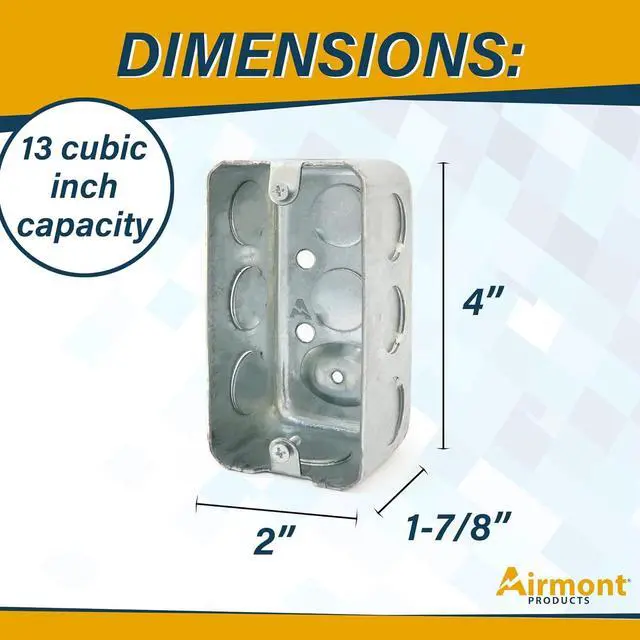 SPECIFICATIONS: This drawn utility electrical box has a capacity of 13 cubic inches. It is 4x2 inch rectangle and has a depth of 1-7/8 inches. The trade size of this box is 1-gang. Also includes a raised ground.