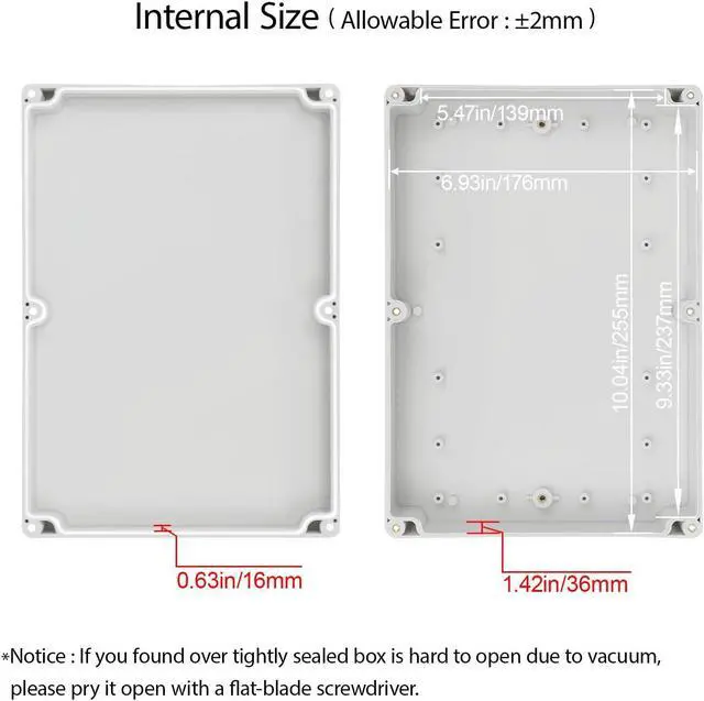 Inner Size of electronic enclosure: 10 x 6.9 x 1.81 inch (255 x 175 x 46 mm) (L*W*H) - - *Tips: in order to confirm the detailed installation dimensions, please refer to our detail image, which shows specific internal dimensions of the product. (Allowable