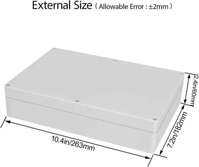 Product SizeExternal Size of the project box: 10.4 x 7.2 x 2.4 inch (263 x 182 x 60 mm);