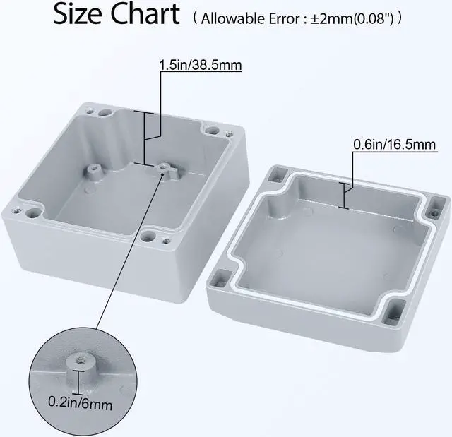 Overall external size: 3.9 x 3.9 x 2.3 inch (100x100x60mm); internal size: 3.7 x 3.7 x 2.2 inch (93x93x55mm) Please refer to picture for specific data.