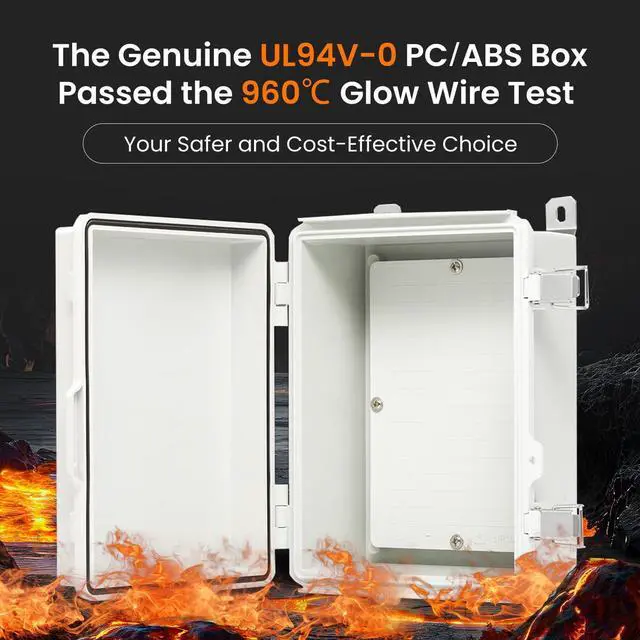 UL94-V0: We understand that customers seek a superior flame-retardant junction box due to fire safety concerns. That' s why we have engineered this enclosure box with UL94-V0 rated flame retardant material, capable of passing the 960°C Glow-Wire Test for exceptional fire protection. By choosing our enhanced flame-retardant electrical box, you can confidently eliminate fire hazards and secure the peace of mind you desire, especially for critical electrical applications