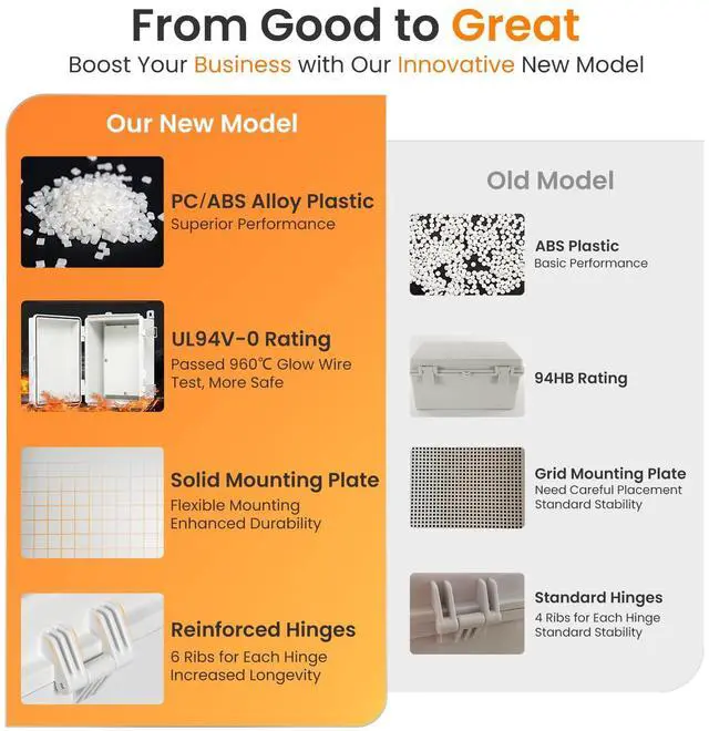 Upgraded Material: This outdoor electrical box is crafted with upgraded premium PC/ABS alloy plastic, delivering superior durability and impact resistance compared to traditional ABS plastic, ensuring a more reliable and advanced solution for your various applications. Whether you are a personal DIY enthusiast, a business customer, or a government client, this product is thoughtfully engineered with you in mind to minimize maintenance and replacements, offering dependable performance for the long term