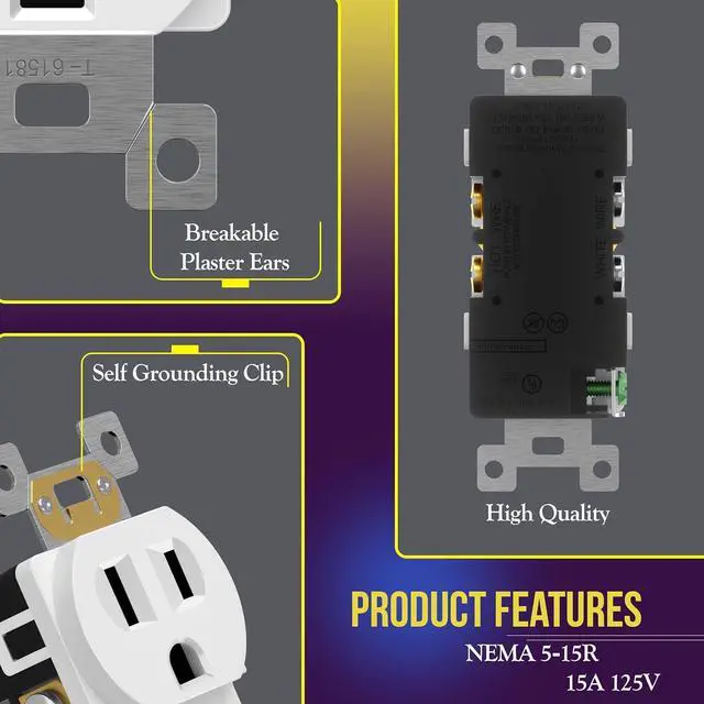 • 10 Pack; 15A 125V, 5-15R, self-grounding, 2-pole, 3-Wire. UL94, V2 Rating, 1-year warranty , UL Listed