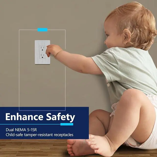 Safe and Reliable - LIDER electrical outlets are designed with safety in mind, featuring child-safe tamper-resistant technology that prevents unwanted objects from being inserted. Complies with 2017 NEC Article 406.12; other specs: 15A 125VAC, 5-15R; Polycarbonate Thermoplastic construction; flammability UL94, V2 Rating; UL Listed. Matching wall plates are sold separately. Enjoy a 1-year warranty for added peace of mind. 5-pack listing.