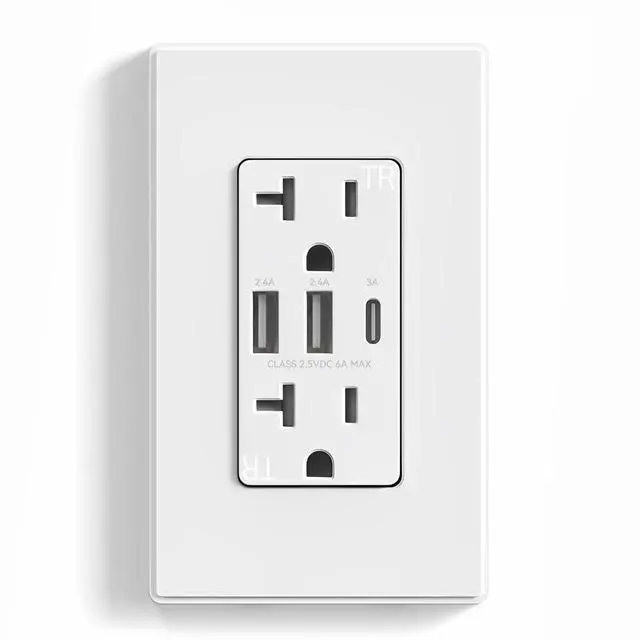 • Durable and SafeOur USB outlets feature efficient power solutions with advanced cooling, reducing heat for safer use and longer product life. Fire-resistant materials, child-proof shutters, and ultra-quiet performance ensure both safety and comfort. USB C tested for 10,000 insertions, USB A for 8,000built to last.