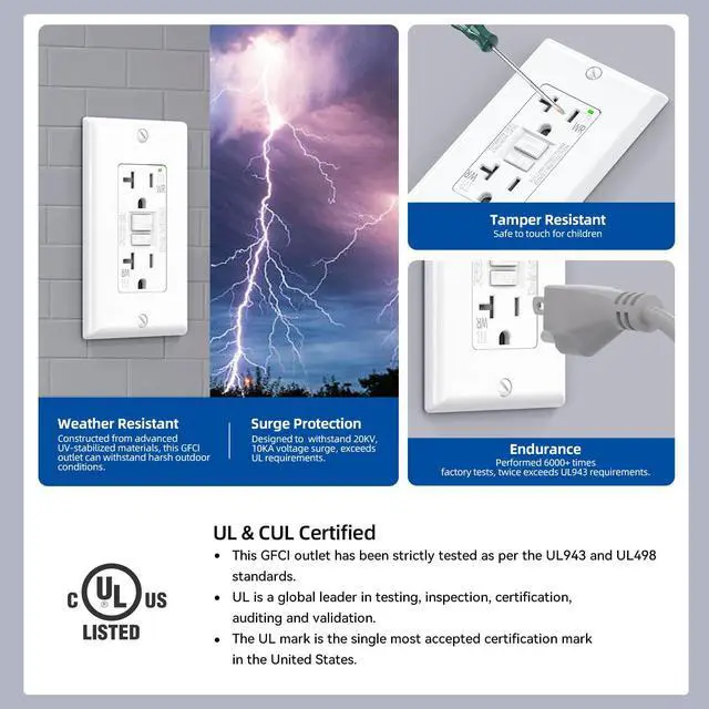 Durable and Ultra-Safe DesignBuilt with premium high-impact resistant thermoplastic materials. Endurance-tested over 6, 000 timestwice the UL requirement. Features advanced safety features like 6kV surge protection, Reset-Disable, and Reversed Wiring Prevention to ensure long-lasting performance and maximum protection.