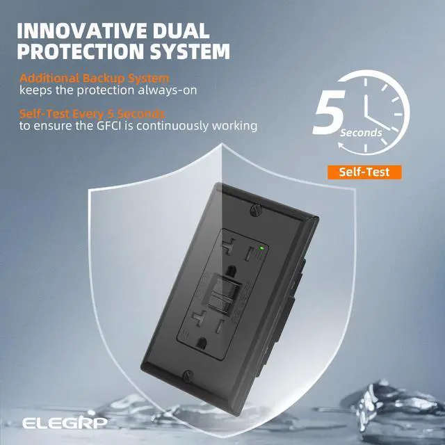 • Patented Self-Test Every 5 Seconds This GFCI outlet automatically performs a self-test every 5 secondsfar more frequently than the UL standard of every 3 hoursto ensure it's always ready to protect against electrical shock. In the event of a ground fault, it cuts power in just 0.025 seconds, providing fast and reliable safety for your home.