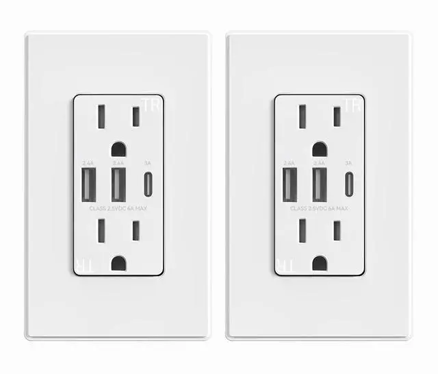 • Durable and SafeOur USB outlets feature efficient power solutions with advanced cooling, reducing heat for safer use and longer product life. Fire-resistant materials, child-proof shutters, and ultra-quiet performance ensure both safety and comfort. USB C tested for 10,000 insertions, USB A for 8,000built to last.