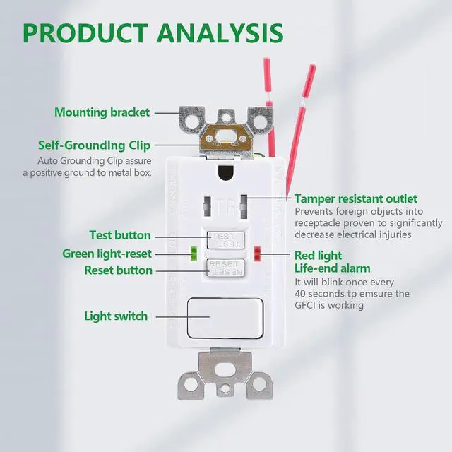 Our GFCI outlet will automatically perform a self-test every 40 seconds (the red light will flash once) to ensure that the GFCI continues to work, which is very suitable for use in homes, offices, hospitals, schools, etc.