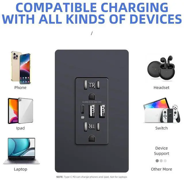 IN-WALL RECEPTACLES: 2 USB A & 1 USB C charging ports with a total output of 6.0 Amp (Fast charge technology not supported). Compatible with all kinds of USB devices with multiple charging protocols. USB charging is compatible with portable 5V devices (such as Bluetooth speakers, GPS devices, etc. )