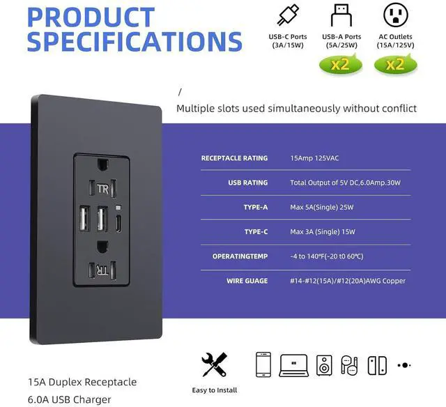 EASY TO INSTALL: Support side wiring and back wiring. All screws have been loosened for ease of installation, there' s no need to loosen the screw. Fits in a standard wall box. Can replace existing outlets. Compatible with standard wall plates and can be multi-ganged with other devices. Providing more space for maneuvering and reducing stress on USB cables.