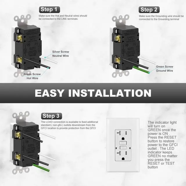 LED indicator: The GFCI outlet features an LED indicator that illuminates when the outlet is working properly. This is a convenient feature that allows users to quickly determine if the outlet is functioning correctly without having to physically inspect it.
