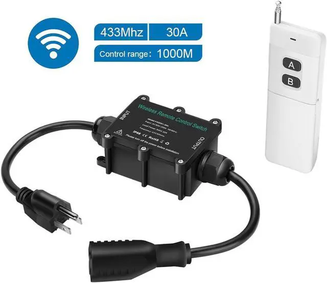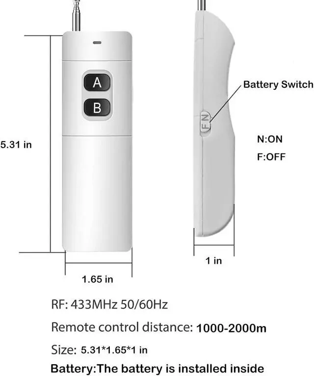 (Long range remote switch): This 110 volt remote control switch has 500-1000m working distance, press button A-ON; Press button B-OFF (DC 9V battery is required, not included)