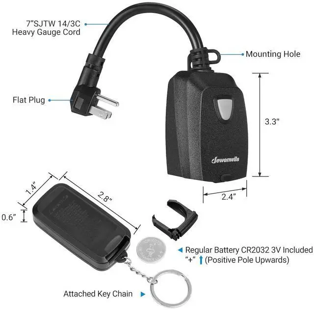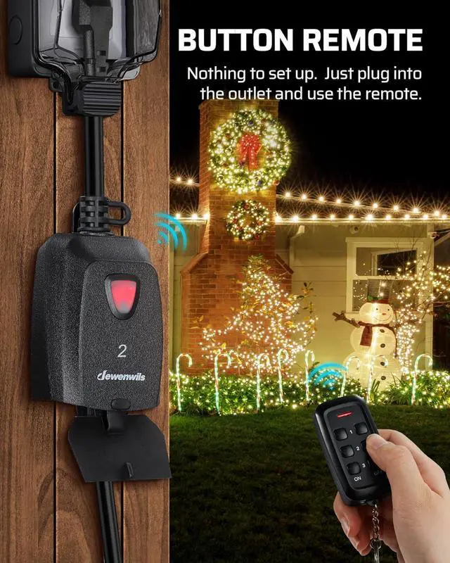 MAKE LIFE EASIER: DEWENWILS remote control switch can remotely turn on/off garden lights, light strings, fountain pumps, sprinklers, lighting fixtures and other electrical appliances with one button. Plug and play, save your time ( CR2032 3V battery included).