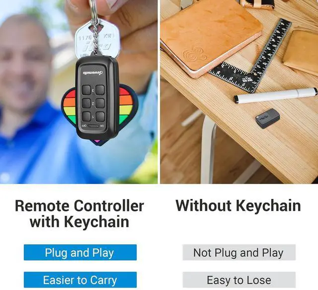 STRONG RF SIGNAL: This wireless remote outlet works through walls and doors without any interference, up to 100 feet range in open areas, does not require line of sight between the remote controller and receiver; The remote controller comes with a key ring, easy to store