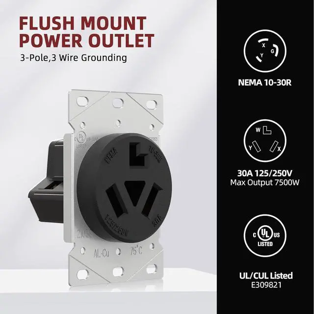 NEMA 10-30R - 30 Amp 125/250 volt flush mount power outlet, 3-Pole, 3-Wire.