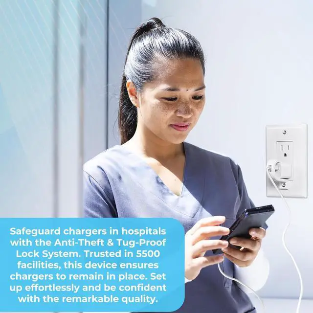 Trusted in 5500 facilities with over 300K units sold: The Lock Socket Charger Lock has a sleek design that blends into any decor. It prevents adults and teens from removing chargers, ensuring they stay secure and in place, and offering extra security in various settings.