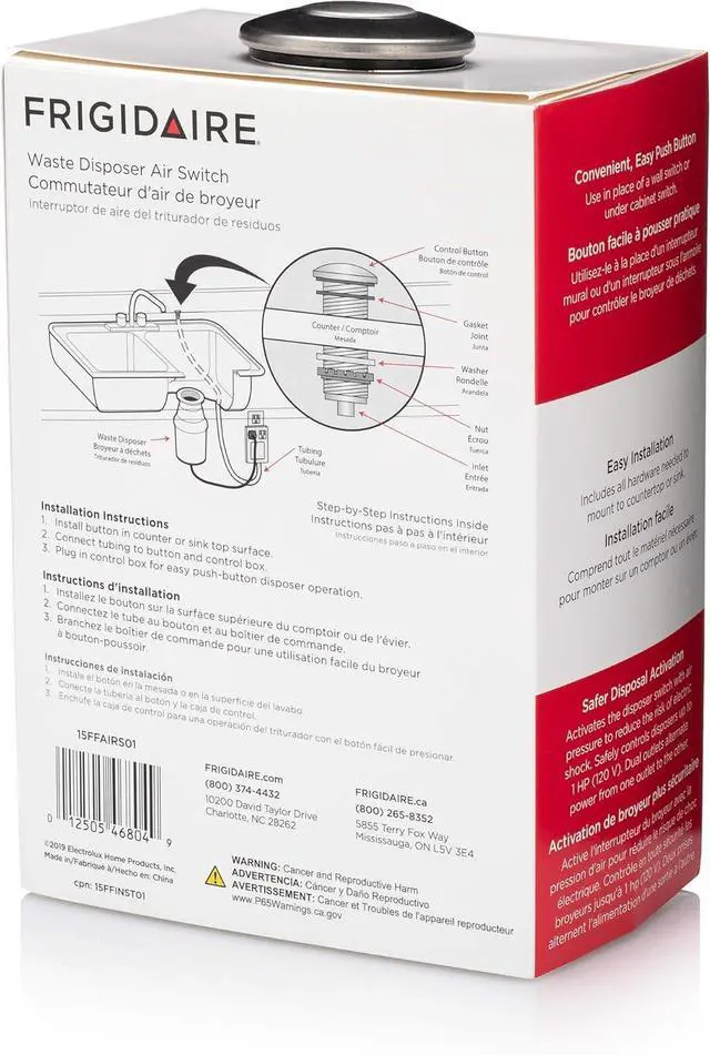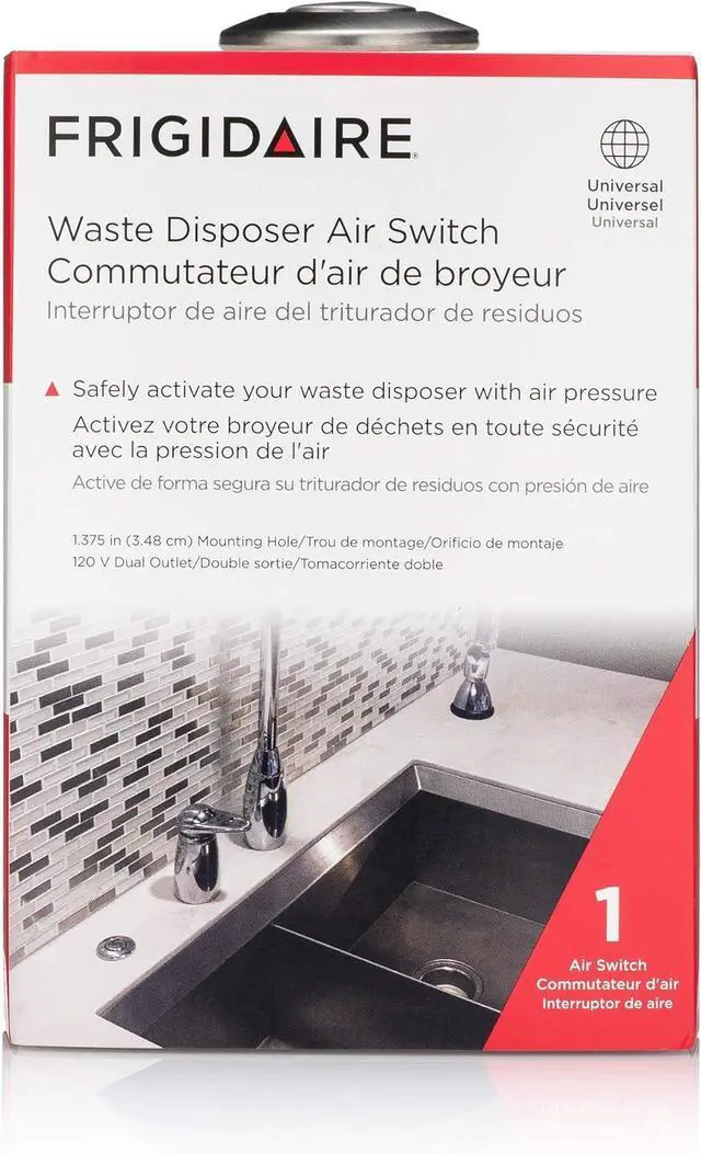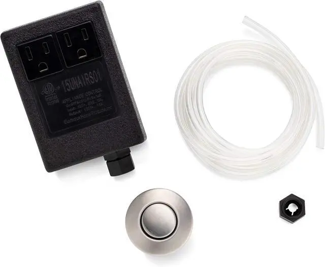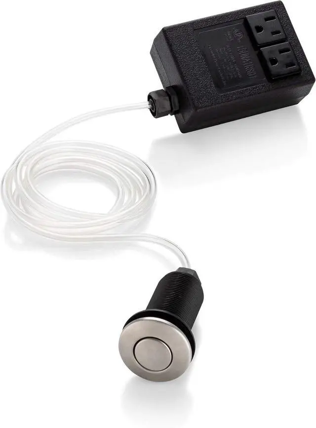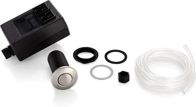 Easy installation. Kit includes plug in control box, brushed nickel button switch, 6 foot air tube, and all hardware needed to mount on countertop or sink