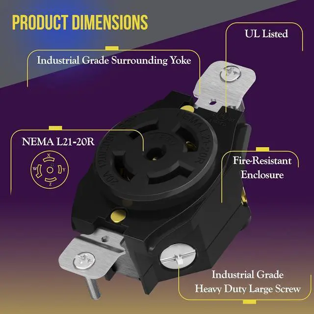 Black color; 20Amp, 125/208Volt; NEMA L21-20R; 4 Pole, 5 Wire; 4AWG Conductors, 12-10AWG; UL Listed; 2-year Warranty