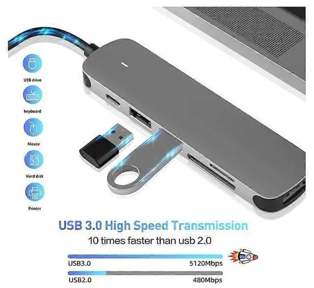 6-in-1 Connectivity: Features USB 3.0 (5Gbps), USB 2.0, USB-C PD charging, 4K HDMI, and SD/Micro SD card readers