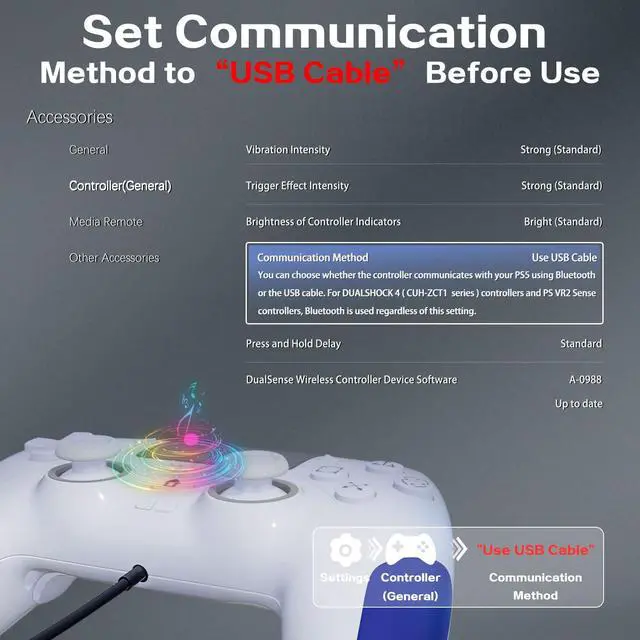 Setup Before Use - " ", otherwise the controller for PS-5 will not work. (Settings> Accessibility> Controller (General)> Communication Method> Select Use USB Cable)