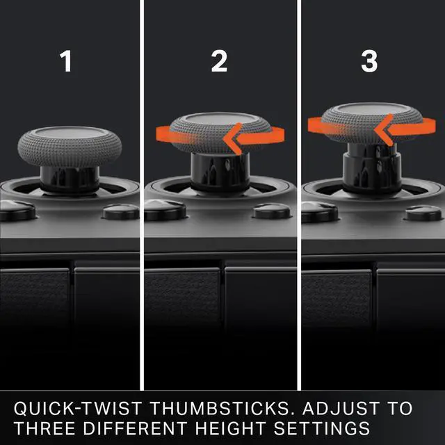 Easily adjust the thumbsticks to three different height settings anytime with a simple twist to customize the control to your gaming style. No parts to swap out. Just twist and play.