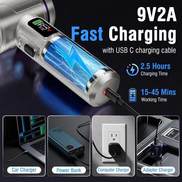 Type-C Fast charge: The car vacuum cleaner with 9V 2A fast charging, it fully charges in only 2.5 hours, compatible with car chargers, power banks and laptops. Built-in surge protection ensures safe use