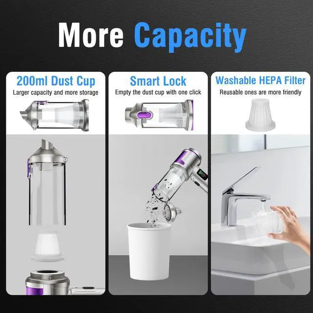 Washable HEPA filtration: This handheld vacuum cordless with a reusable HEPA filter traps 99.9% of dust, maintaining strong suction and avoiding clogs. Easy to wash and reuse. The 200ml dust cup empties in one simple click