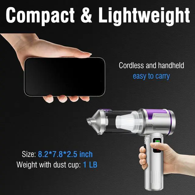 Sleek, lightweight, ultra-convenient: At just 1lb and 8.2*7.8*2.5in, this hand held vacuum cordless is easy to operate single-handedly. It fits in glove boxes, bags or drawers, great for cars, RVs and small spaces