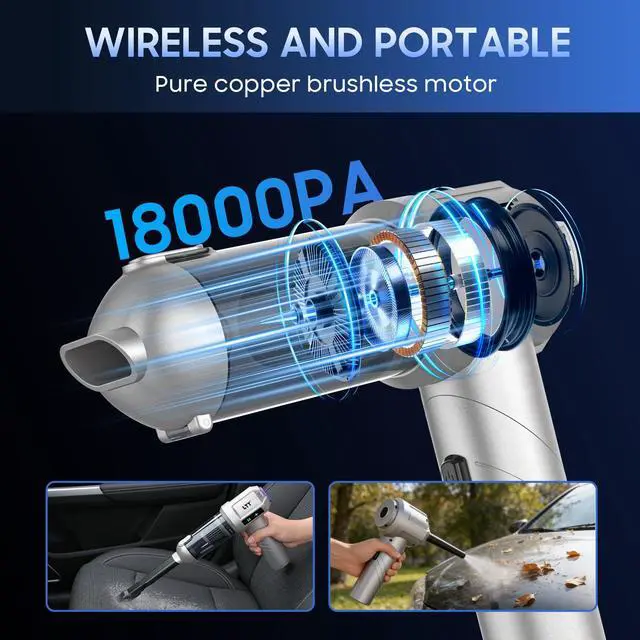 Brushless Motor High Powercar vacuum portable cordless.air dust high-speed brushless motor with 18000PA Suction Power.Compared to traditional motors, the brushless design offers stronger suction, enhanced performance, and a longer lifespan