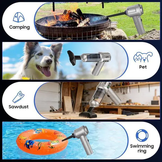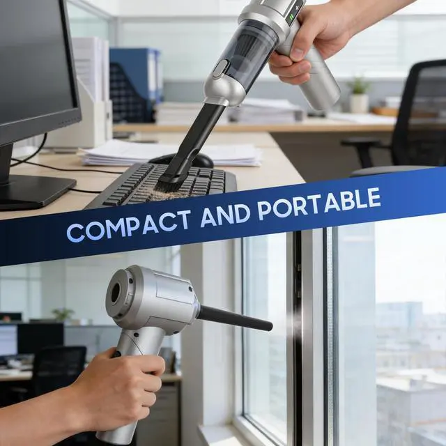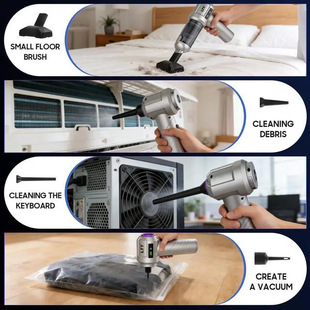 Air Duster & Vacuum Cleaner 2 in 1Hand held Vacuum Cordless, two functions: it can suck and blow. You can use it to easily blow away dirt, debris, dust, and other particles, as well as to suck out the tiny stubborn dirt hidden in keyboards, corners, and crevices. The powerful function of this small vacuum cleaner makes the dust no behind and brings you a comfortable life