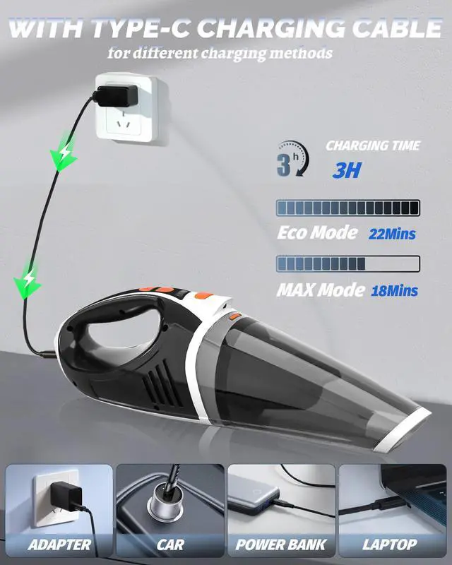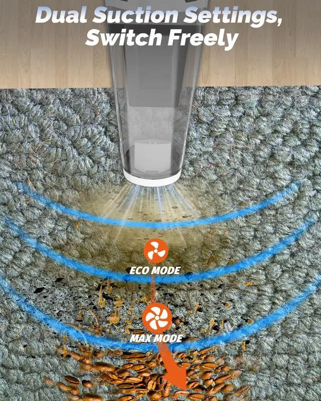 2 SUCTION, EFFECTIVE CLEANING: Handheld vacuum cordless with strong motor can provide powerful suction, with one button to switch between 2 modes! 6000Pa ECO mode: suitable for daily cleaning, keyboard dust removal, and desktop cleaning. 8000PA MAX mode: suitable for cleaning car carpets and seat gaps.