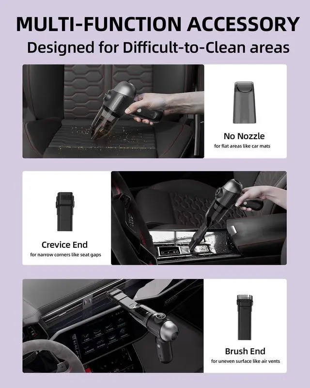 This vacuum’s compact, lightweight design makes it easy to carry anywhere, whether for your car, office, or small home spaces. With its cordless convenience and multiple attachments, it’s perfect for quick clean-ups wherever you need them.