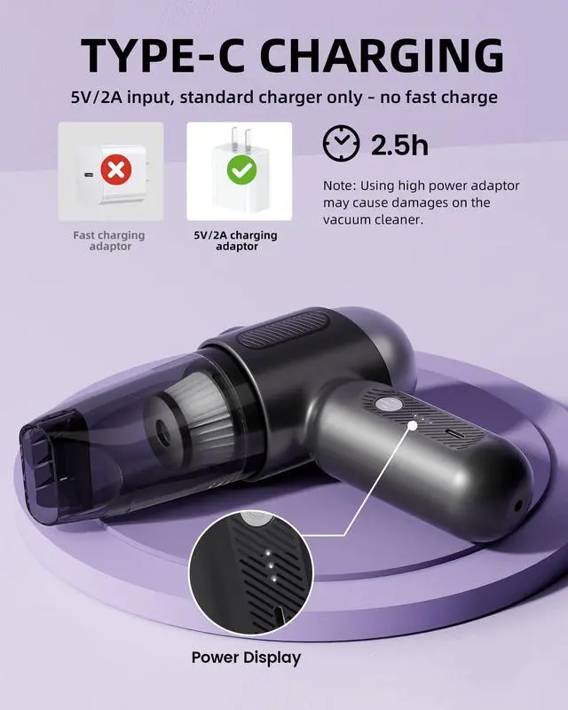 Use a 5V/2A adapter to ensure the vacuum charges efficiently. This helps to maintain battery health and ensures the vacuum is always ready when you need it.