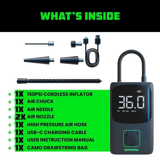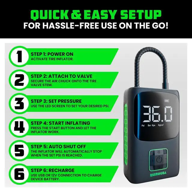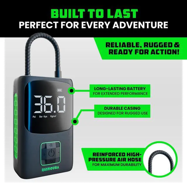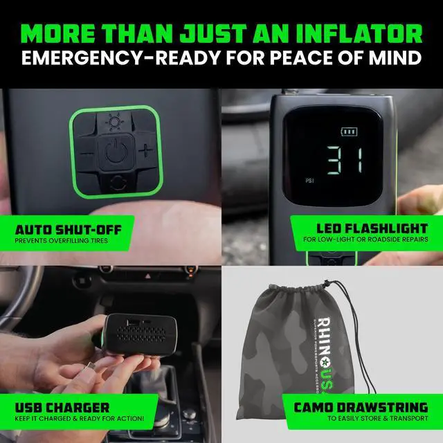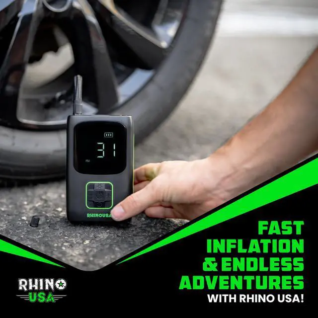 Experience convenience and speed with the Rhino USA Portable Tire Inflator. Powered by a robust 7800mAh Lithium Ion battery, this inflator can handle up to 4 car tires on a single charge, inflating each tire in just 1 minute thanks to its 150 PSI maximum pressure and 34 L/Min airflow. Its compact design fits easily in your car or bag, making it perfect for emergencies. Featuring an automatic shutoff function for safe, accurate inflation, this versatile tool is ideal for car tires, motorcycles, bikes, sports equipment, and more. Keep the Rhino USA Portable Tire Inflator on hand for quick and reliable inflation whenever you need it.