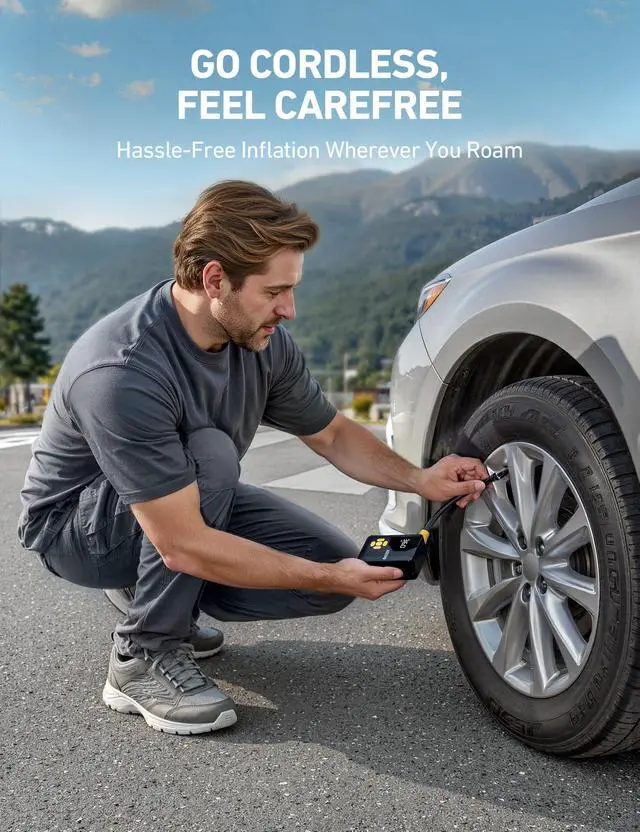 L7 Mini Tire Inflator Portable Air Compressor, 150 PSI Cordless Car Tires Air Pump with LED Lights&Pressure Gauge, Auto Shut-Off - Tire Pump for Auto, Motorcycle, Bicycle, Ball Yellow