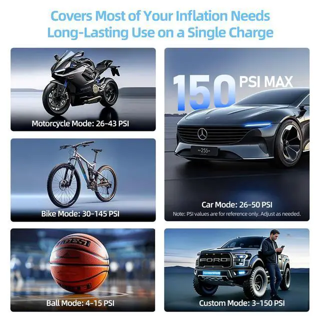 4 SMART MODES with AUTO SHUT-OFF - ±1 PSI Precision: Take the guesswork out of inflation with dedicated presets for Car, Motorcycle, Bike, and Ball. Set your target PSI on the clear LCD digital display, and the auto shut-off feature stops exactly at the right pressure every time - no over-inflation, no constant checking. With ±1 PSI accuracy, it meets professional-grade standards for precise inflation.