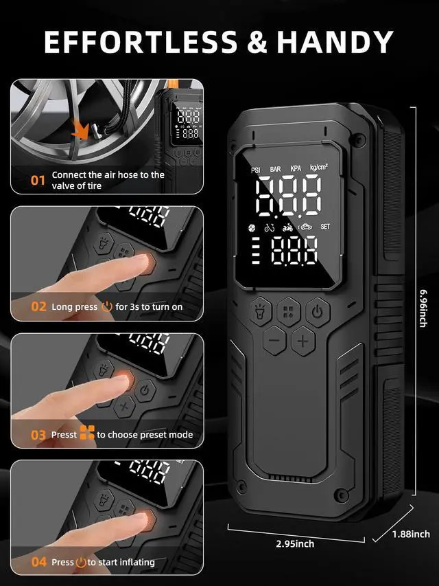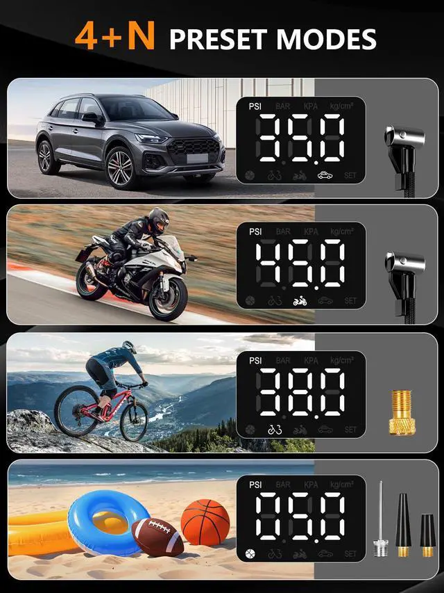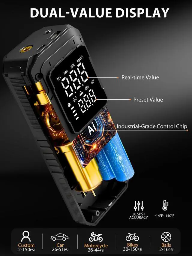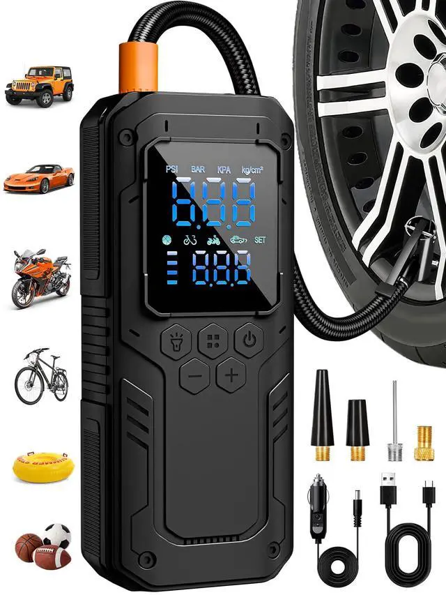 Accurate LCD Display & Auto Shut-Off: Portable air compressor stay in control with a precise LCD screen that shows real-time tire pressure. Simply set the desired PSI, and the pump for car tires automatically shuts off when it reaches the correct value, preventing over-inflation. Designed for drivers, cyclists, and weekend adventurers who demand safety and accuracy