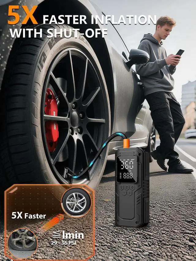 Powerful & Fast Inflation: For commuters rushing to work or road-trippers far from help, the AIRSURE portable tire inflator offers peace of mind with 5X faster than other air pump, and a max pressure of 150 PSI. It inflates 195/65R15 tires from 29 PSI to 36 PSI in 1 minutesaving time when it matters most. Its the must-have car tire pump for flat-tire emergencies, daily checks, or spontaneous road trips