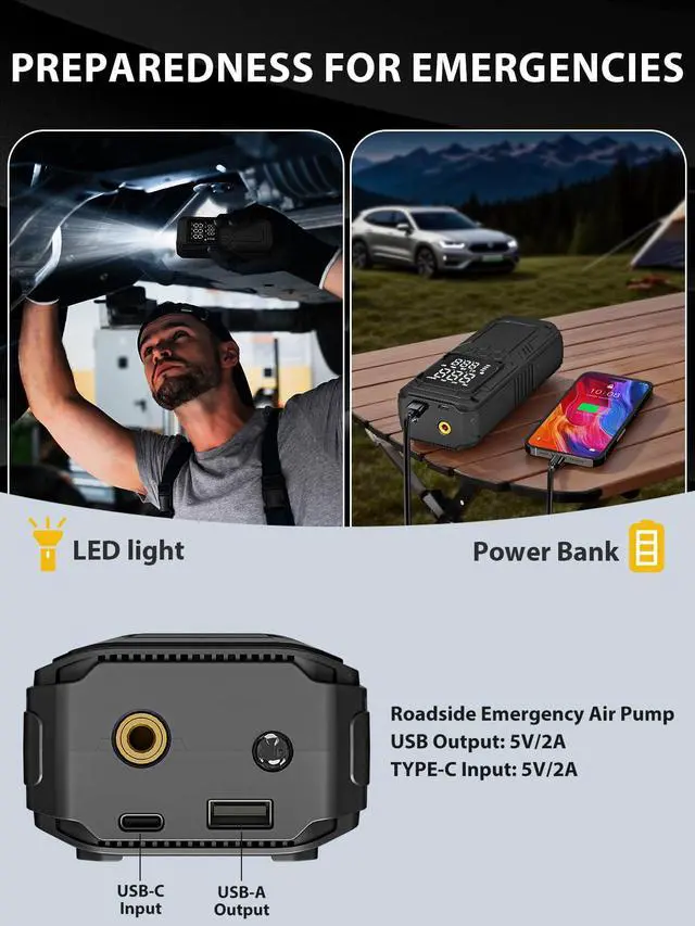 Flat tire in winter? Stay ready with fast inflation, USB backup power, and dual 12V/battery use—anywhere, anytime, even in freezing temps