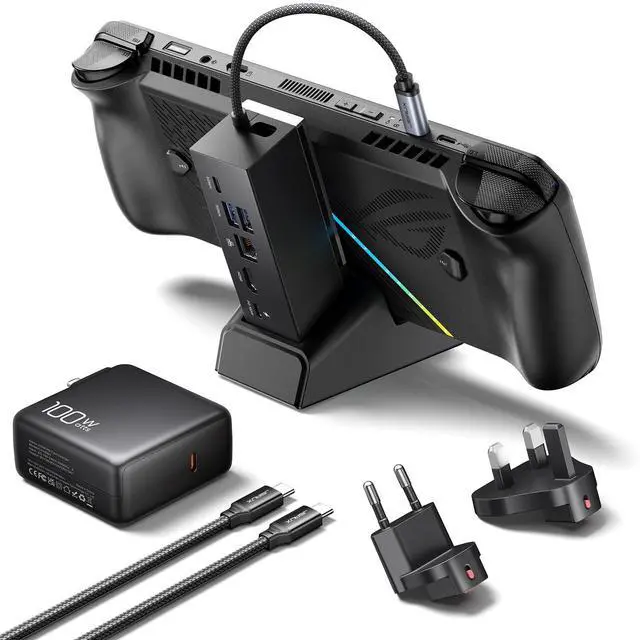 What You Get: 1× Docking Station HB0609, 1× 100W Charger, 1× USB C to USB C Cable, 1× European Plug Adapter, and 1× UK Plug Adapter