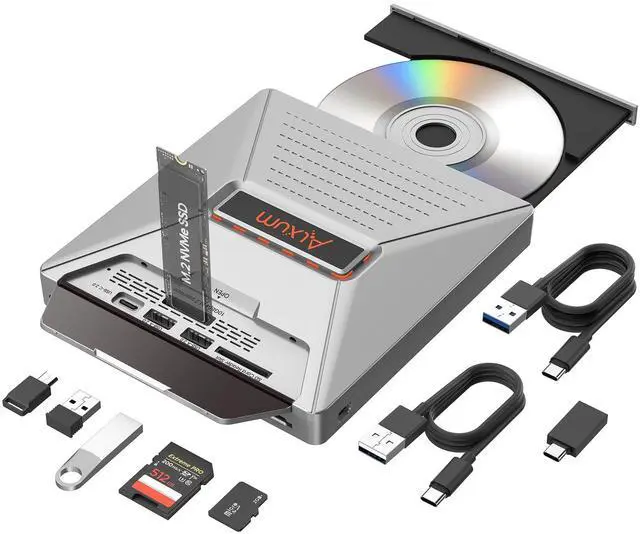7-in-1 Laptop External CD/DVD Drive: Features 3*USB2.0(2A1C)+M.2 NVMe Interface+SD+Micro SD+CD DVD burning, offering versatile connectivity and functionality for all your data storage and media needs, including reading and writing SD/Micro SD cards simultaneously and supporting M.2 hard drives for expanded storage options.