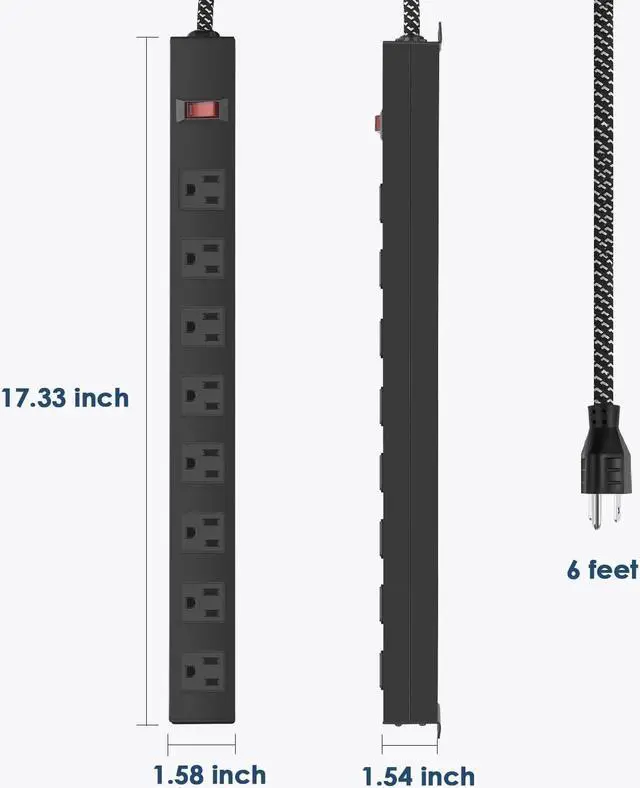8 in 1 Power StripThis mountable power strip features 8 outlets and 1 switch, providing you with multiple options to connect your devices. With a 6 feet 14AWG braided cord, it ensures durability and easy reach to power sources. Rated at 1200J, 1875W, 15A, 125V, 60Hz, and with SGS certification, it guarantees safe and reliable charging.