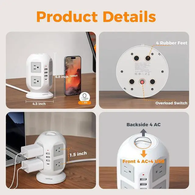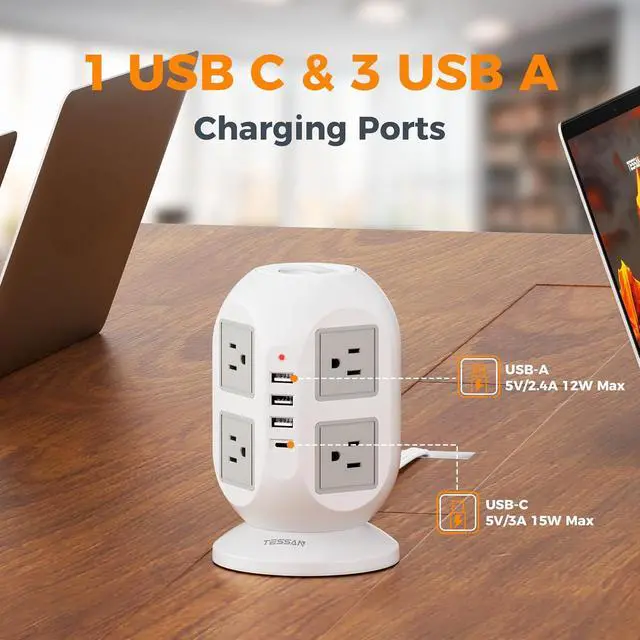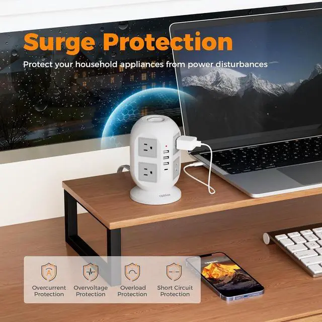 TESSAN Surge Protector Tower: Equipped with overload protection, short-circuit protection, over-current protection, and etc; Reliable on/ off switch can automatically shut off and protect your expensive electronics, providing you with a safe and reliable charging environment