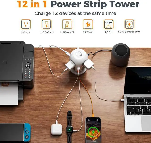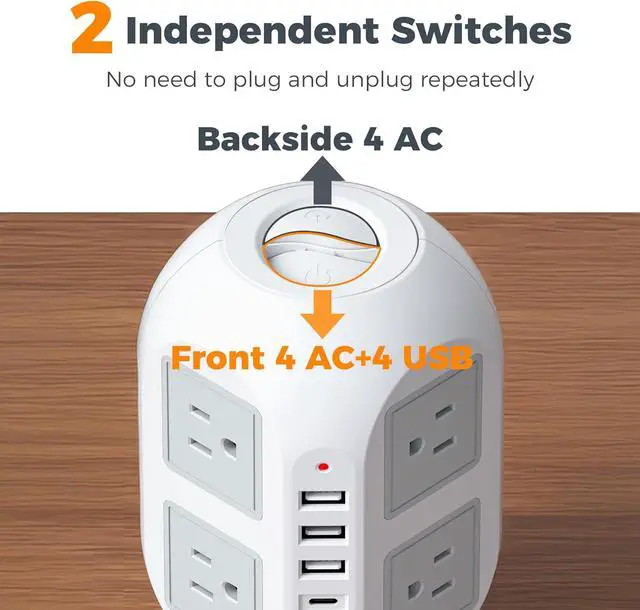 Tower Power Strip with Individual Switches: With 2 independent switches on the top, easy to manage power supply of devices, no need to plug and unplug repeatedly;
