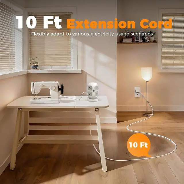 Flat Extension Cord 10Ft: With only 0.31 in ultra thin flat head design, flat plug power strip can easily fit in tight spots and hide behind sofa, bed, nightstand or other furniture, sitting flush against the wall; 45° right angle design create an extra space for other plug below without blocking