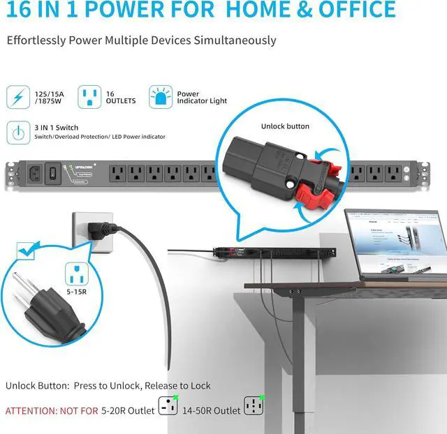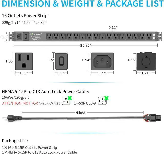 [Powerful Multi-Outlet, Reliable Performance] The Apislogik heavy-duty power strip ( 25.8 x 1.7 x 1.5 inches) features 16 NEMA 5-15R outlets with a 6ft self locking power cable (125V/12A, MAX 15A), capable of powering up to 16 devices simultaneously. Supports computers, printers, monitors, TVs, and more, providing stable and reliable power for multiple devices at once.